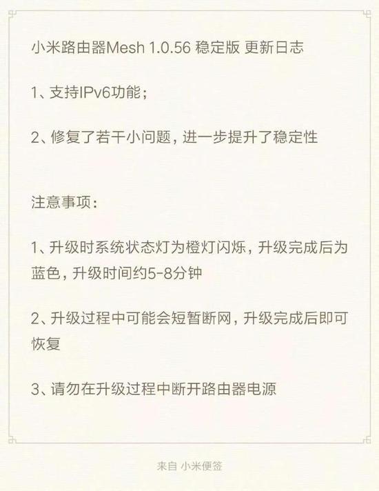 7月17日消息 据官方消息,小米路由器Mesh(D01)获OTA系统升级,本次更新将分批次进行,用户将在接下来1周内陆续收到更新。本次主要升级内容