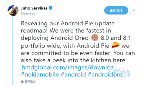 日前,HMD CEO @Juho Sarvikas 在twitter公布了Nokia手机2019年更新Android Pie的路线图,并表示在奥利奥时期Nokia就是最快跟进的厂商