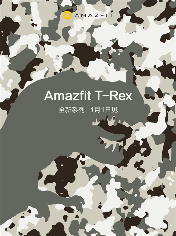 12月26日消息,华米科技宣布Amazfit T-Rex全新系列,将于1月1日宣布。T-Rex翻译过来就是霸王龙的意思,在这张预热海报中,我们也能看到霸