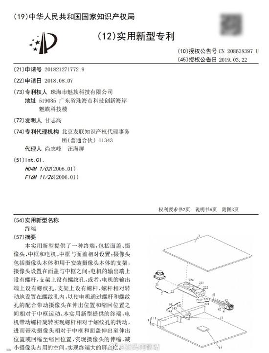 根据最新的中国知识产权局公布的专利申请书,珠海市魅族科技有限公司已经申请了实用新型专利,通过描述和图示是设备上的升降摄像头专利。据