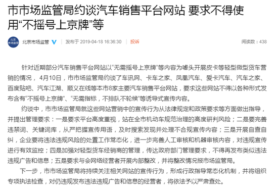 北京市场监管微博消息,针对近期部分汽车销售平台网站以无需摇号上京牌等内容为噱头开展皮卡等轻型微型货车营销的情况, 4月10日,北京市