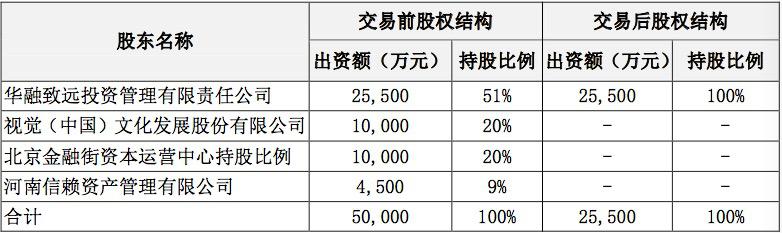 视觉中国5月16日公告称,公司及河南信赖资产管理有限公司、北京金融街资本运营中心,通过减资的方式,退出所持华融创新投资股份有限公司的